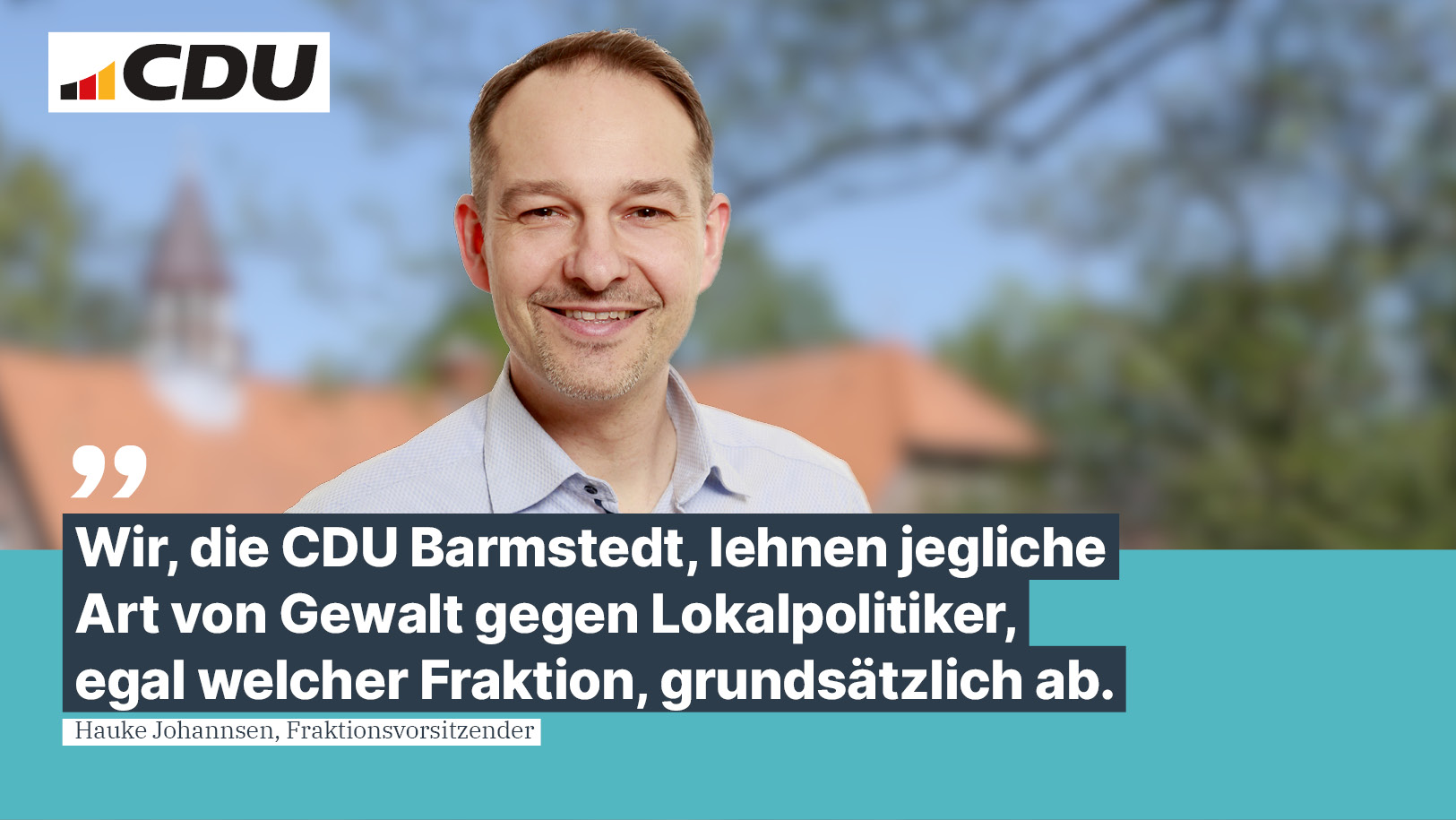 „Sicherlich haben wir unterschiedliche politische Sichtweisen oder auch Interessen. Allerdings lehnen wir, die CDU Barmstedt, jegliche Art von Gewalt gegen Lokalpolitiker, egal welcher Fraktion, grundsätzlich ab. Politische Kämpfe werden in Worten ausgefochten, wie es sich unter guten Demokraten gehört,“ betont Hauke Johannsen, Fraktionsvorsitzender der CDU Barmstedt.